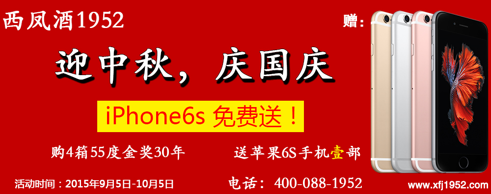 西鳳酒1952舉行買4箱55度西鳳酒1952金獎(jiǎng)30年,送蘋果6S手機(jī)壹部!西鳳酒史上最強(qiáng)促銷,時(shí)間到了,就沒了,快快來吧!電話:400-088-1952
